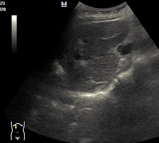 La primera imagen correspnde al hidatide de higado que ya es antiguo y está tratado e inactivo, las dos últimas corresponden al de riñon (espero que me lo confirmeis) que salio inesperadamente en la eco.